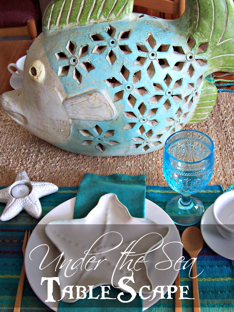 This is just gorgeous!! You cannot imagine my delight when I saw your tablescape posted at Tablescape Thursday. I absolutely adore aqua and teal used in any tablescape and this lovely sea theme tablescape is no exception. I am adoring the "Big" fish in your centerpiece and everything else from the placemats to the water goblets. I have been thinking of creating a seascape tablescape too and you have inspired me to get busy and get it done. Your newest follower..... Candy